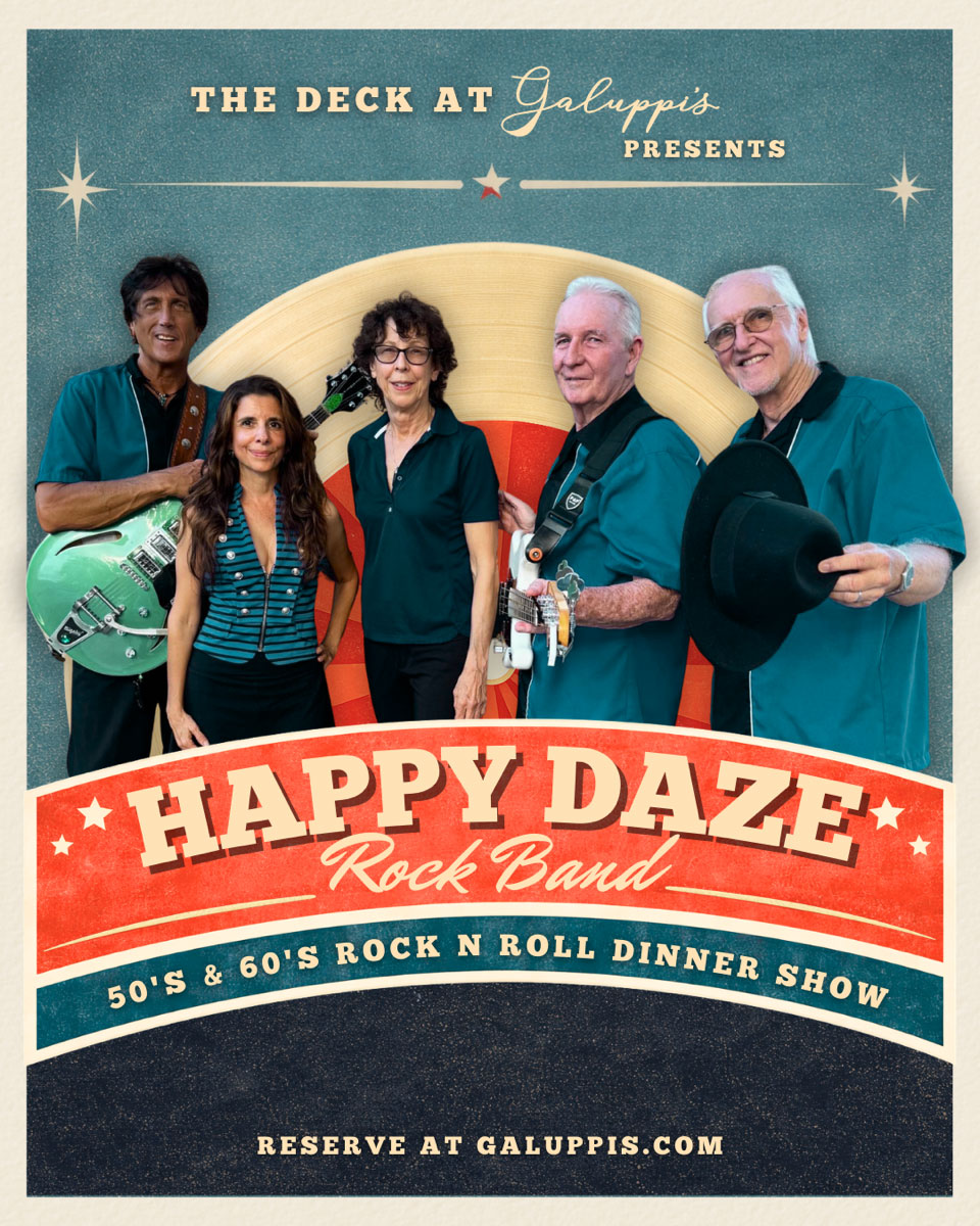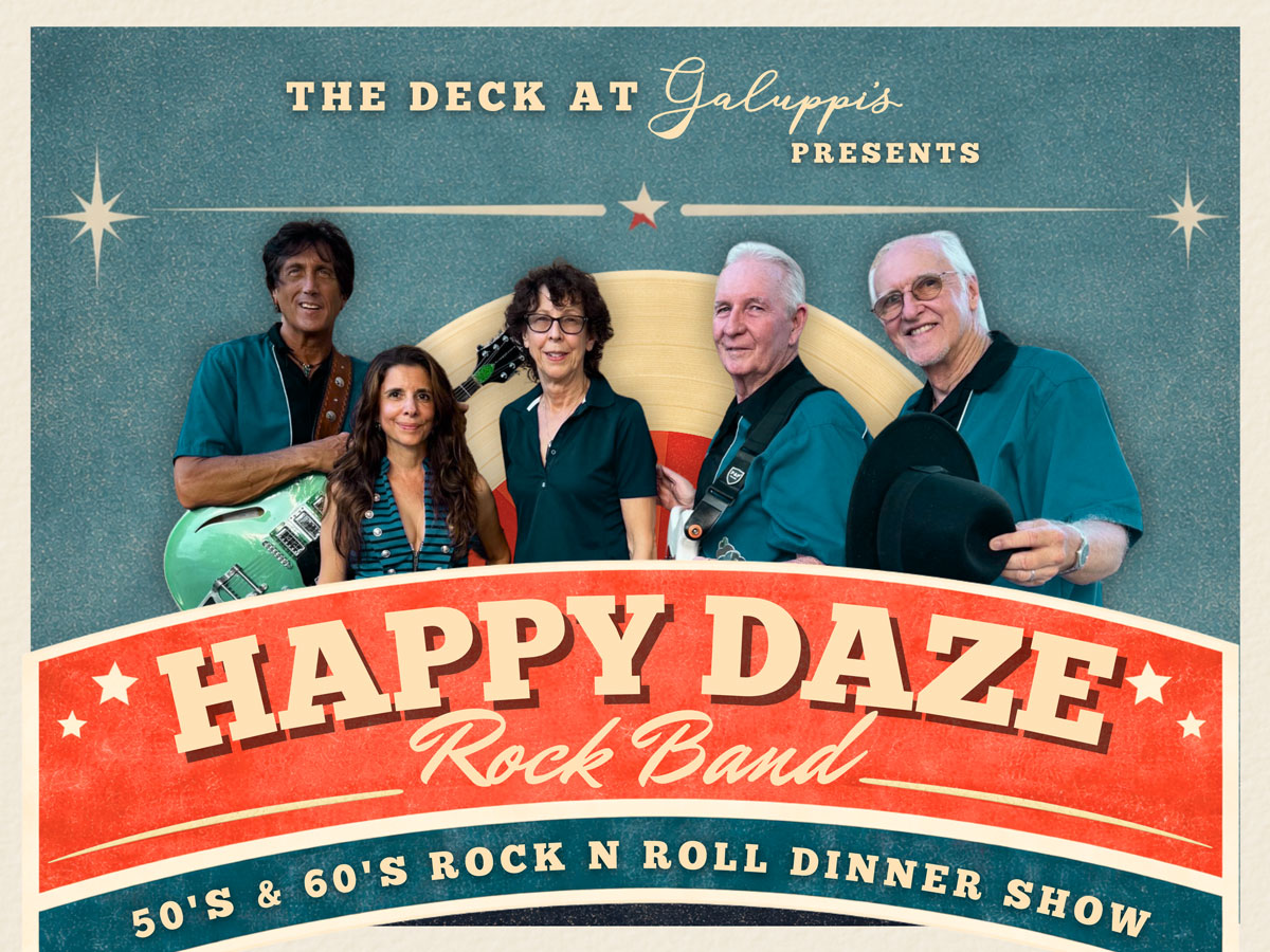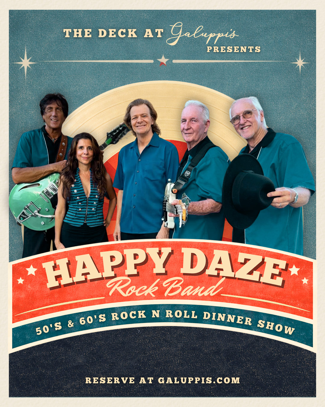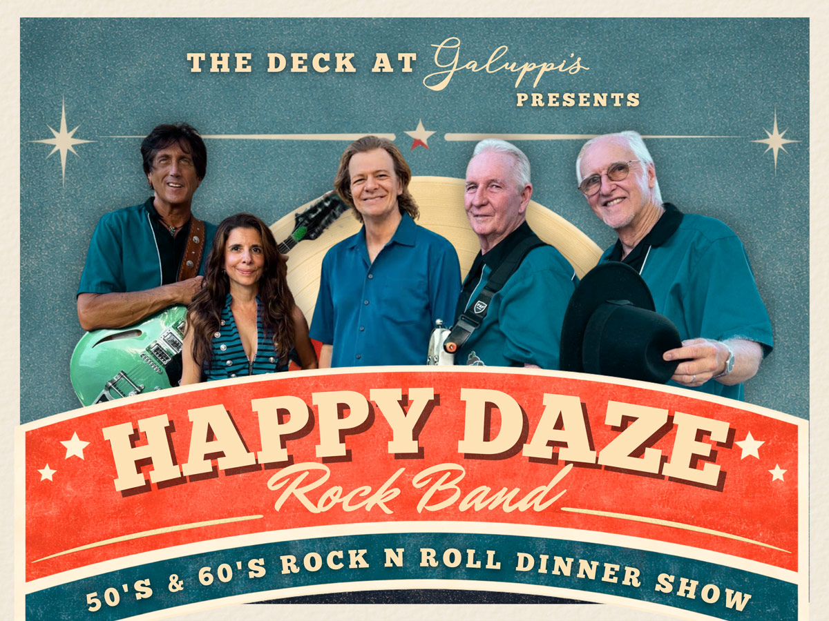 Experience an unforgettable evening on The Deck @ Galuppi’s, where dinner and live entertainment come together in an intimate, waterfront setting. Step back in time and relive the golden era of rock ‘n’ roll with Happy Daze, the ultimate ‘50s and ‘60s tribute band, in a high-energy dinner show that will have you singing, dancing, and reminiscing all night long!