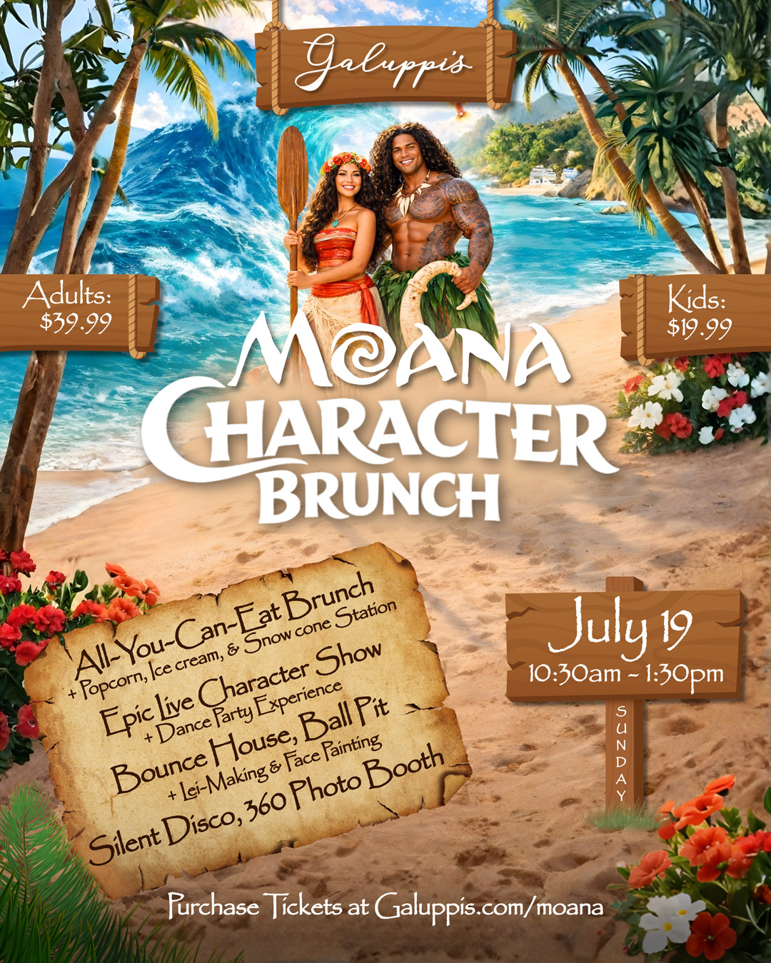 Set sail for an unforgettable Moana Character Brunch at Galuppi’s in Pompano Beach, Florida! Join us for an island-inspired, all-you-can-eat brunch experience featuring a live Moana character show, interactive dance party, bounce house, ball pit, lei-making, face painting, and even a silent disco for the kids. This family-friendly brunch event in South Florida is perfect for toddlers, kids, and parents looking for fun things to do in Pompano Beach or Broward County.