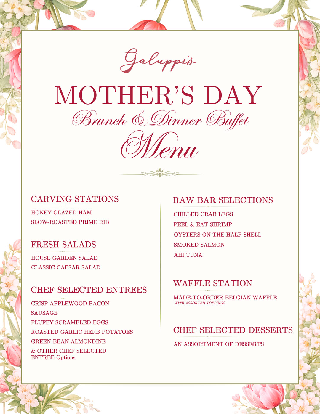 Join us for a special Mother’s Day celebration featuring both a Brunch Buffet and Dinner Buffet.