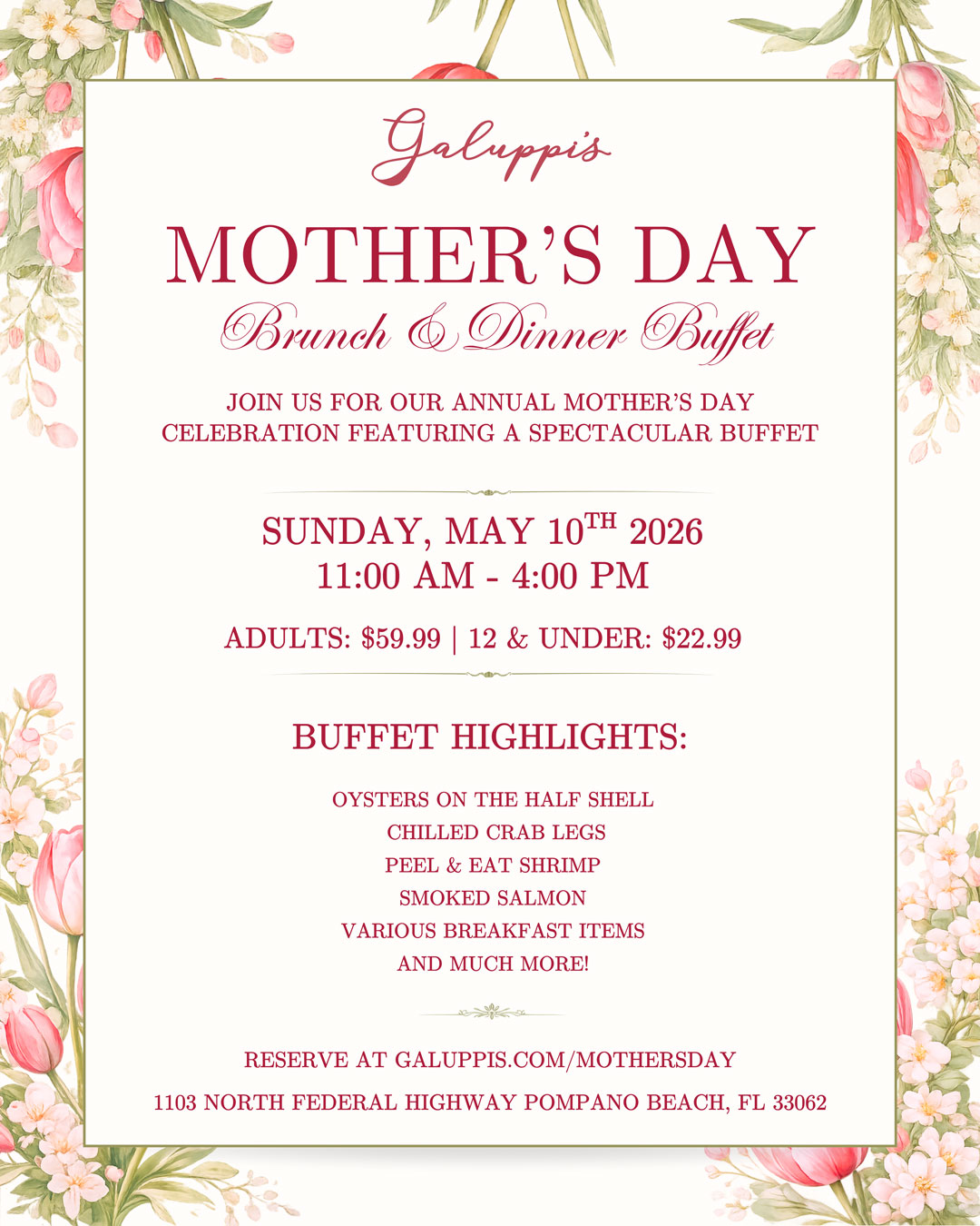 With incredible food, lively entertainment, and picturesque views, Galuppi’s is the perfect place to celebrate Mother’s Day and create unforgettable memories in Pompano Beach.